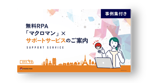 マクロマンの使い方をはじめ、RPAの内製化、社内教育の外注などお客様ごとに個別にカスタマイズした内容で支援します。【マクロマンの操作自体をアウトソース】RPAに関する導入~導入後の運用保守、内製化の支援などお客様の状況にマッチしたサポートを柔軟にプランニングさせていただきます。スポットでのご依頼から常駐派遣までさまざま対応します。サポート全般に関する詳細はサポートページをご覧いただくか、問い合わせフォームよりお問い合わせください。