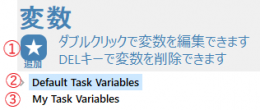 | 2 | Default Task Variables | マクロマン内で使用できる変数が複数用意されています。 ダブルクリックまたは▷ボタンをクリックすることで 詳細を確認できます。 |